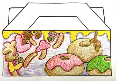 ♦「さくやドーナツ」というドーナツ屋さんがあります。ワクワクするような持ち帰りの箱のデザインを考えましょう。「さくやドーナツ」の文字は入れても入れなくてもよいです。(正面から見た長方形の部分のみ描く) |