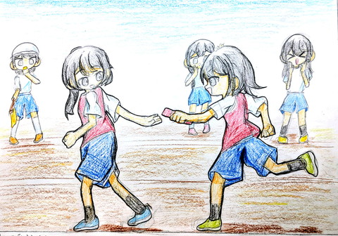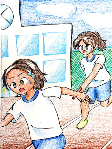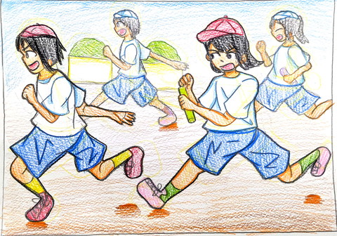 ♦あなたの学校でもうすぐ運動会があります。体育の時間に友達とリレーのバトンパスを練習しているところをを描きましょう。 |